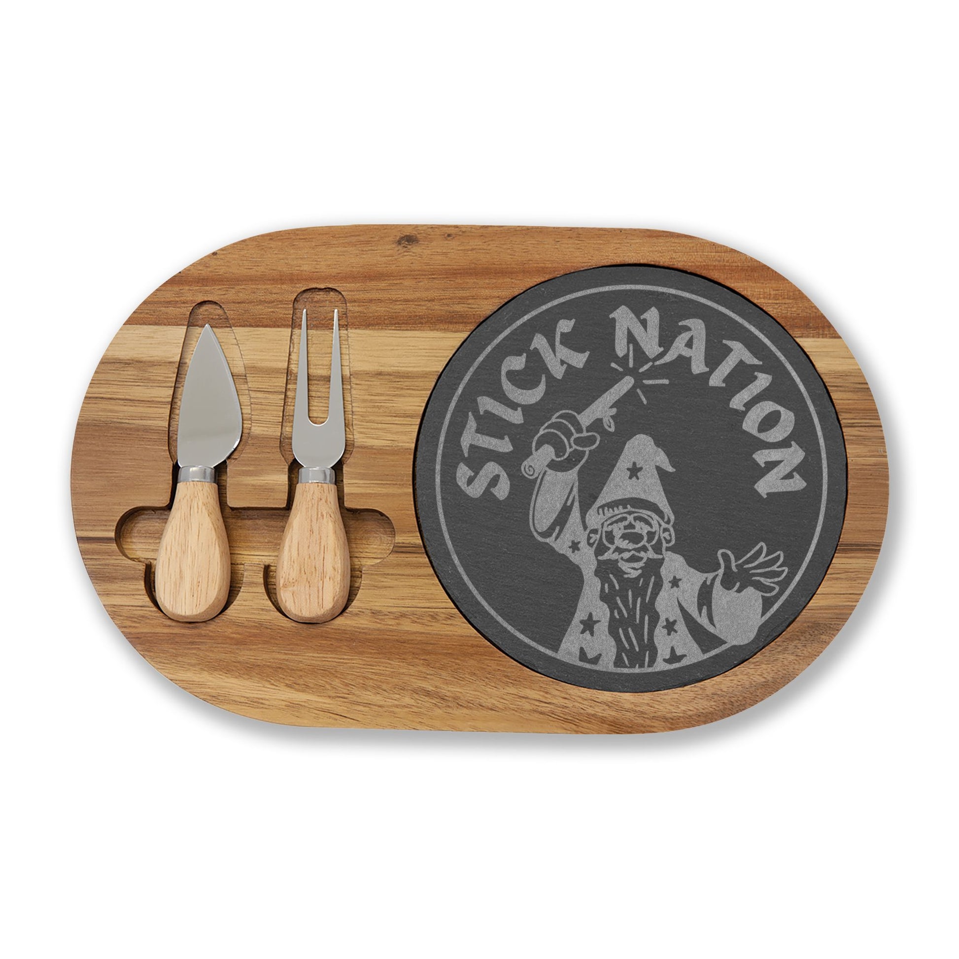 This engraved acacia and slate charcuterie board brings rustic charm and organized function to relaxed gatherings. The warm, grained acacia base cradles a removable slate round that accepts a light-grey engraved design, adding a personalized, artisanal touch. Two compact cheese knives nest neatly in carved slots, keeping serving tools tidy and ready. Stick Nation Forever!
