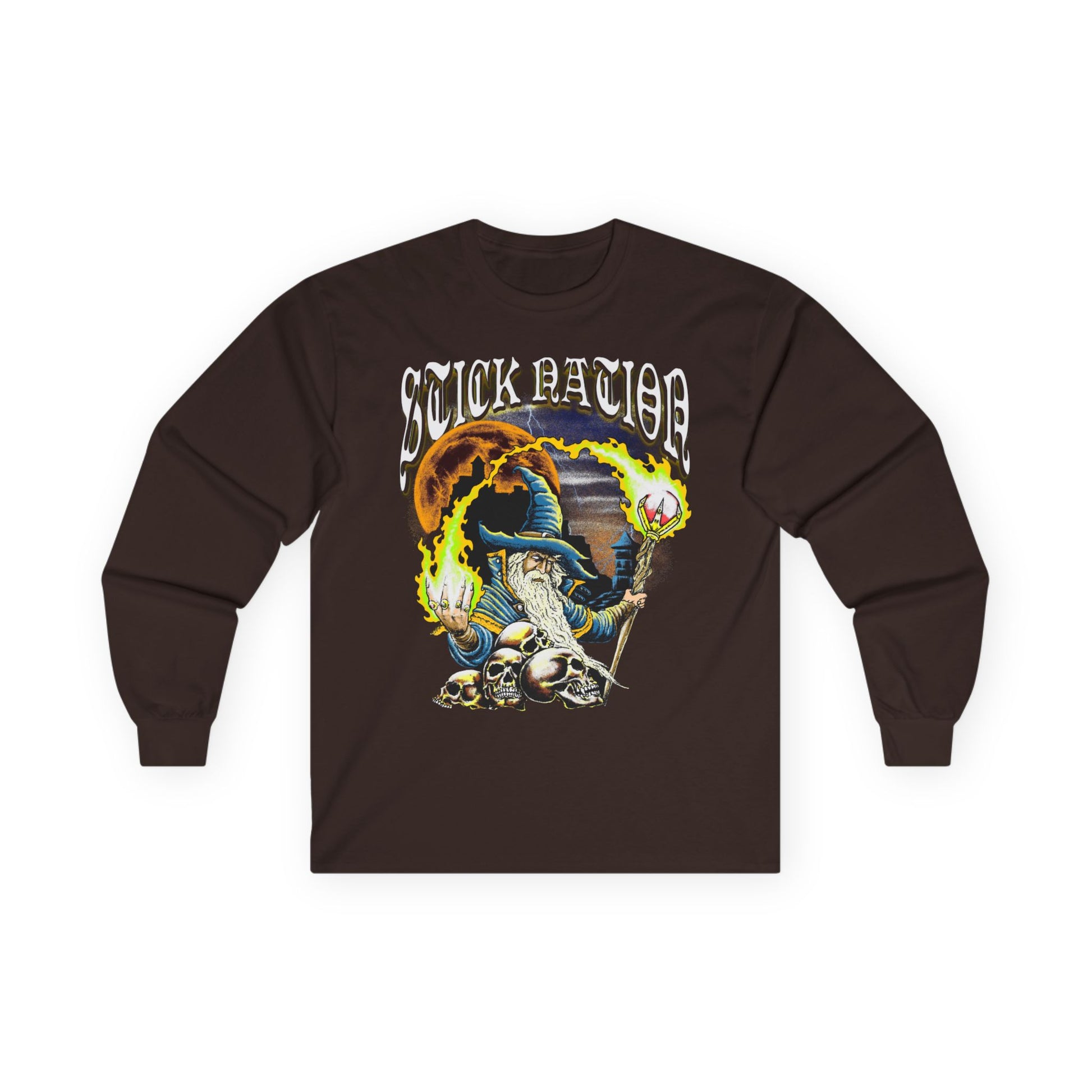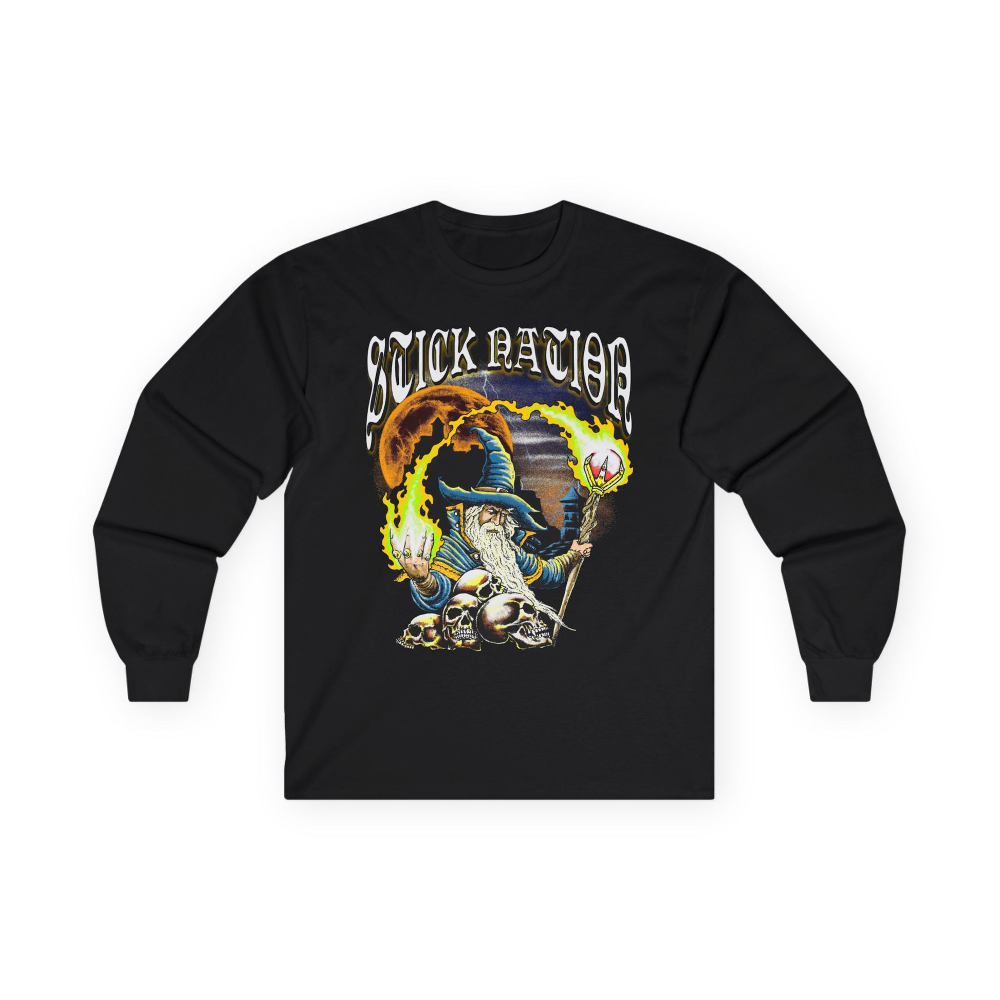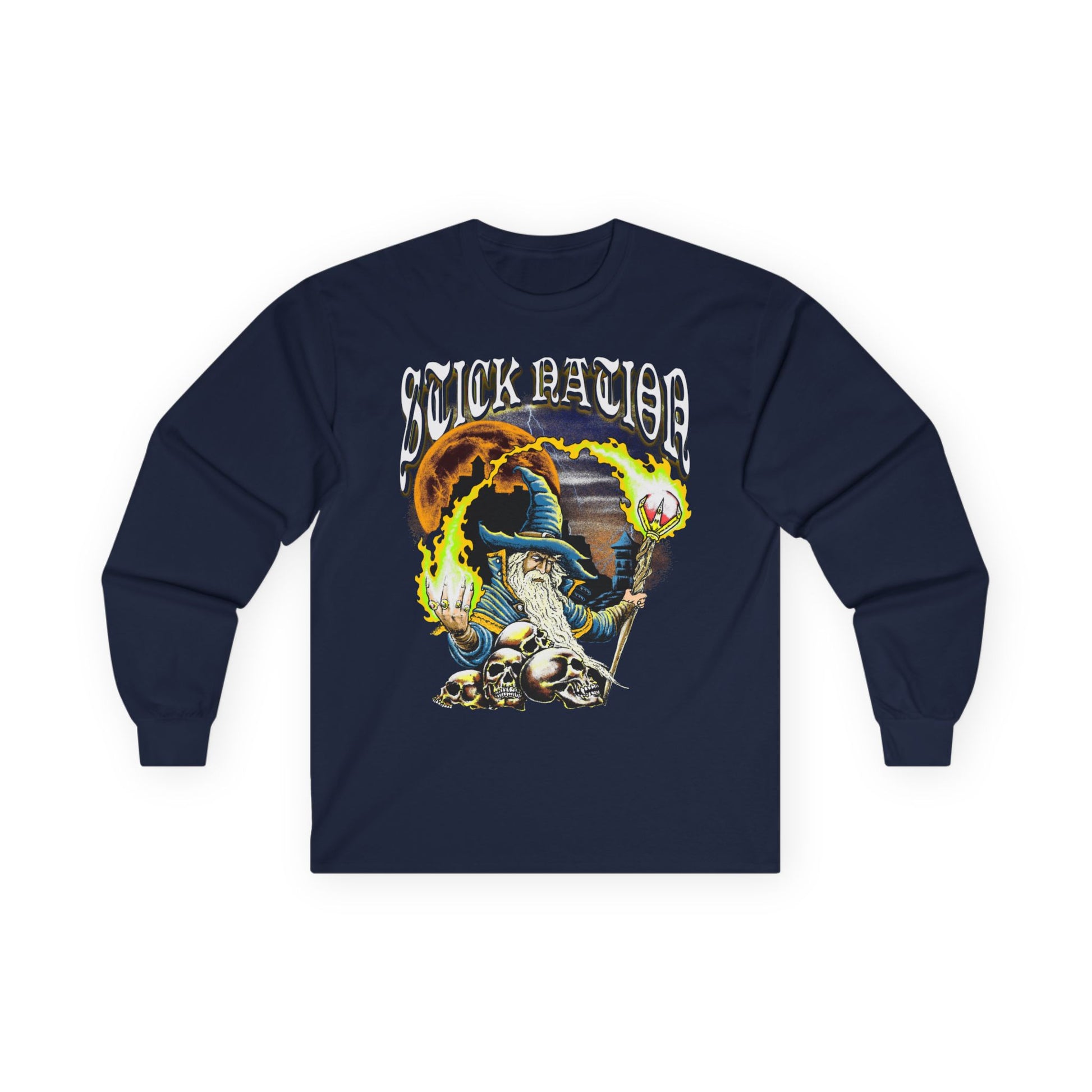 This long-sleeve tee brings a gritty, old-school magic to your everyday rotation. Perfect for all wizard activies and magic festivities. Lets Rock n Roll Stick Nation.